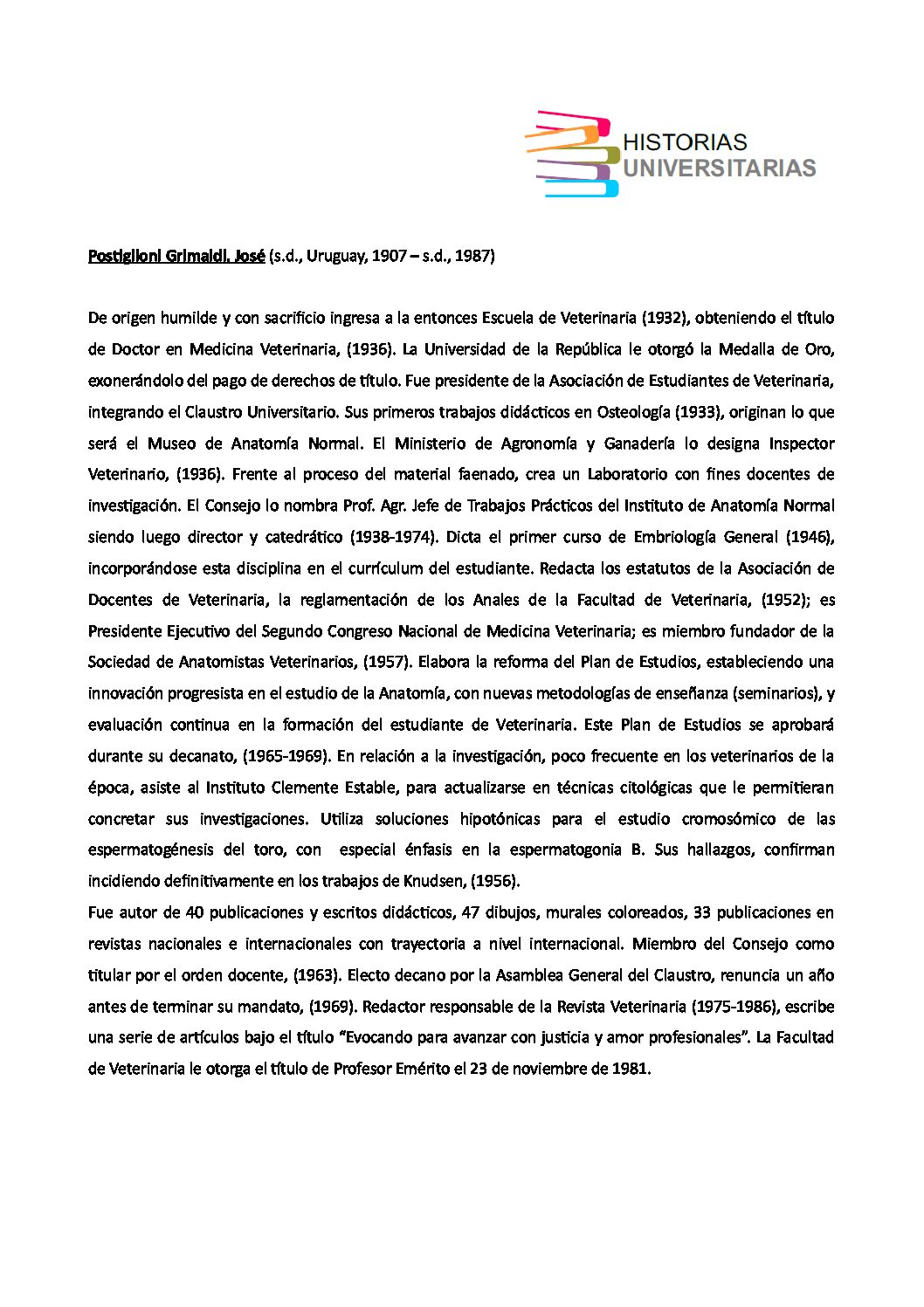 Informe del Decano, Prof. Dr. José Postiglioni Grimaldi, sobre su participación en el V Congreso Panamericano de Medicina Veterinaria y Zootecnia (Caracas) y en la primera Reunión Latinoamericana sobre Educación Veterinaria (Maracay) realizados del 18 al 24 y del 26 al 30 de setiembre de 1966 respectivamente, en Venezuela. Montevideo: Facultad de Veterinaria, 1966. Disponible en http://www.biur.edu.uy/F